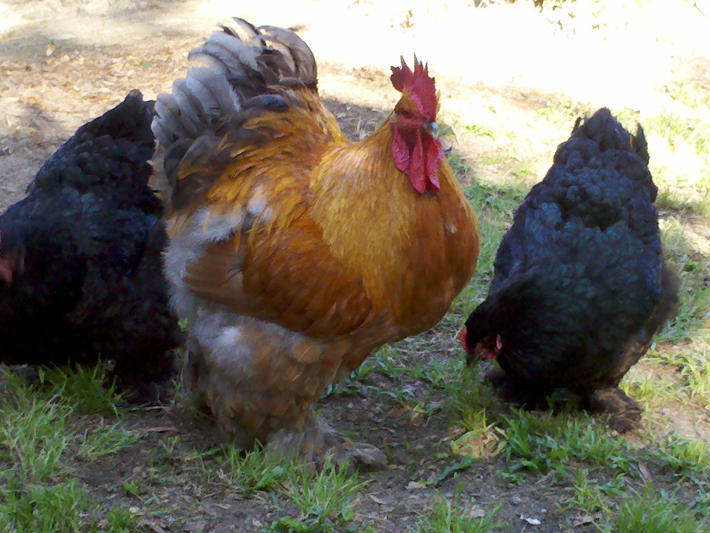 Bo Blue at one year old, enjoying an evening stroll with the ladies through the back yard. He has kept his amazing feathering on his feet and legs. Already we are seeing his coloring and feathering passed down to future generations.